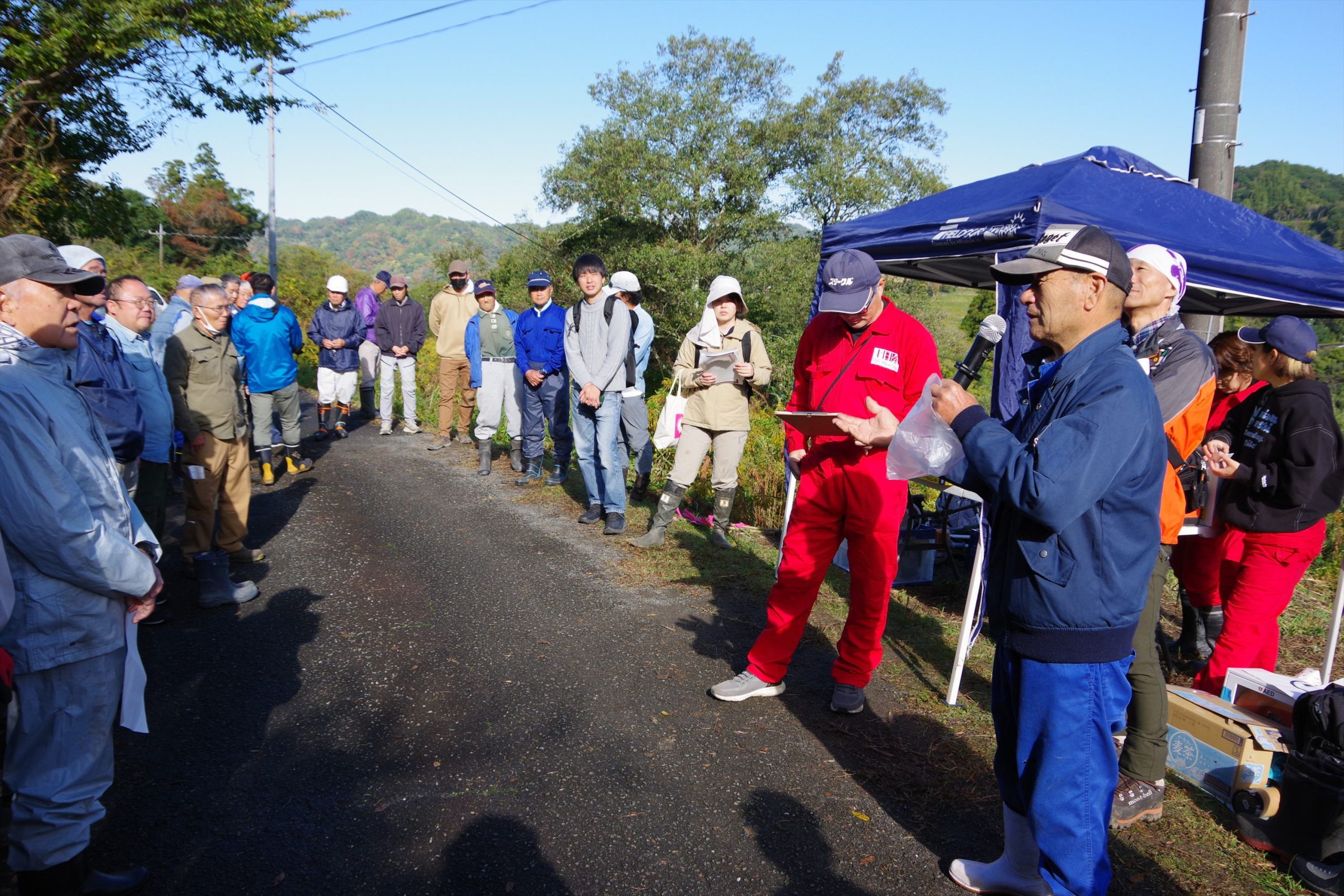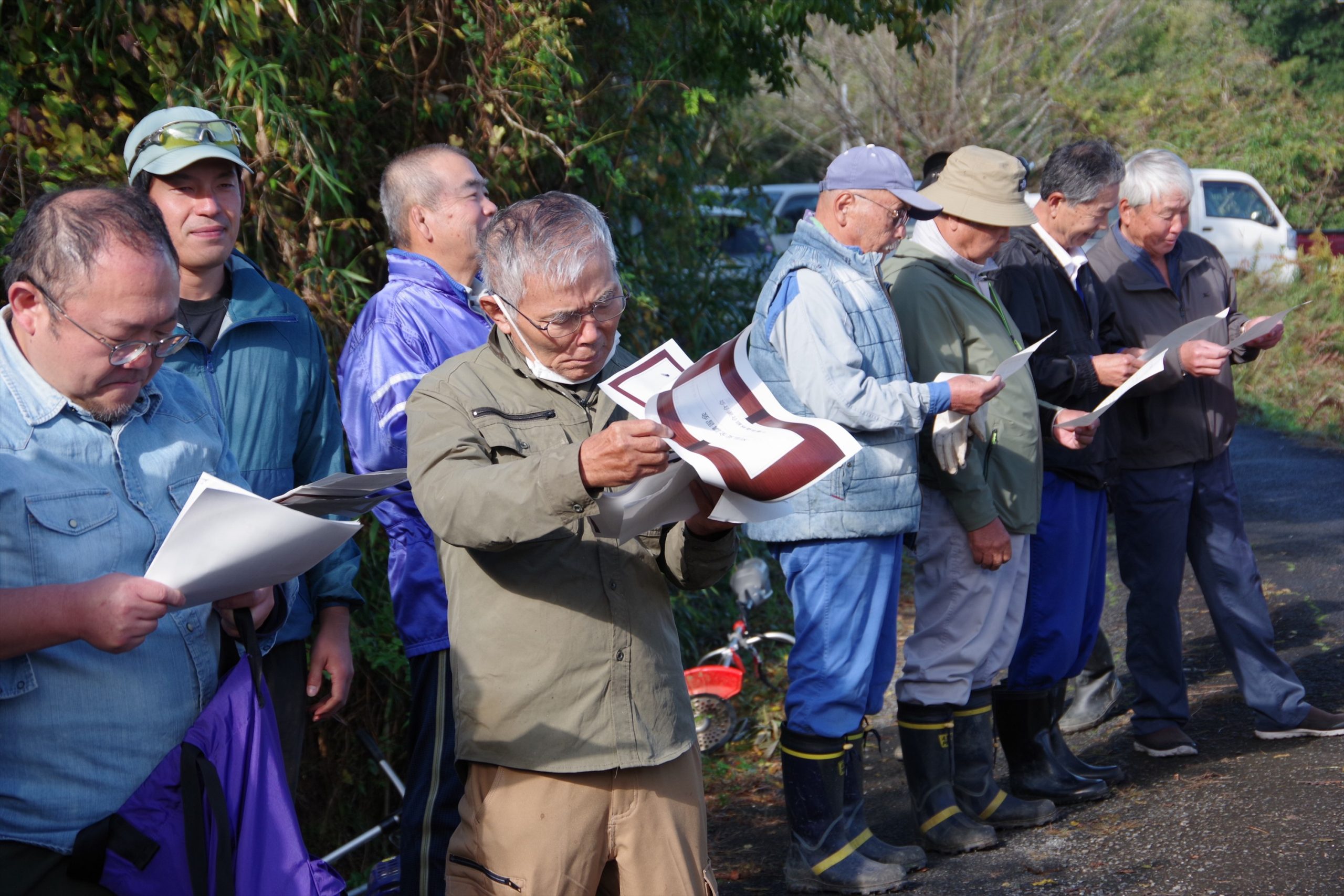 参加者の皆さんは配布された資料を手に、機械の安全な扱い方や装備などの解説に耳を傾けました。一歩間違えれば大けがにもつながる草刈作業。ここで気持ちが引き締まります。
